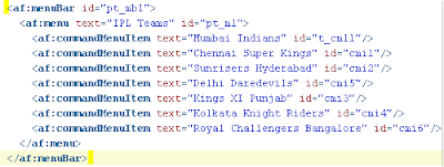 Dropdown menus are a common requirement for web applications. In HTML we can create using elements like ul, li, div e.t.c. In ADF, We can achieve using menu bar and menu components.