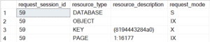 - KEY — Exclusive (X) Lock – This is the most important row for blocking. Session 59 holds an exclusive lock on an index key. Any other session trying to read or update this same key will be blocked.
