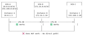 ❌ VCN-A to VCN-C: No communication possible (through VCN-B) – Instance in VCN-A (10.0.1.5) cannot reach instance in VCN-C (192.168.1.20) – Even though VCN-B is connected to both – Even if you add a route in VCN-A: 192.168.0.0/16 → LPG-AB – The packets will be dropped at VCN-B
