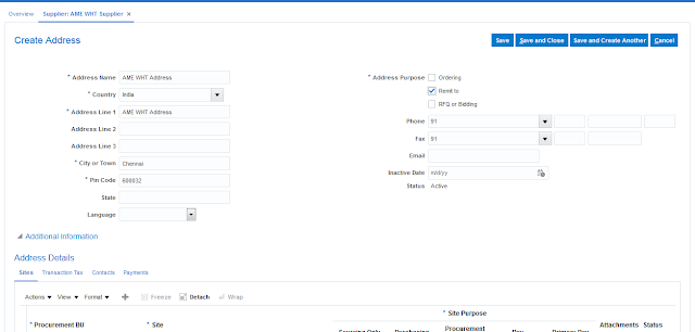 Step 13:Supplier Site Creation: when creating the Supplier site, we can enter all the required information.