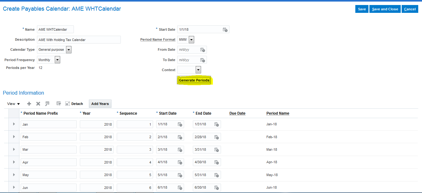 Step 16:Enter the Required information for Creating the WHT Calendar an click on Generate the periods so that system automatically system generate WHT Calendar for 12 periods like Jan to Dec