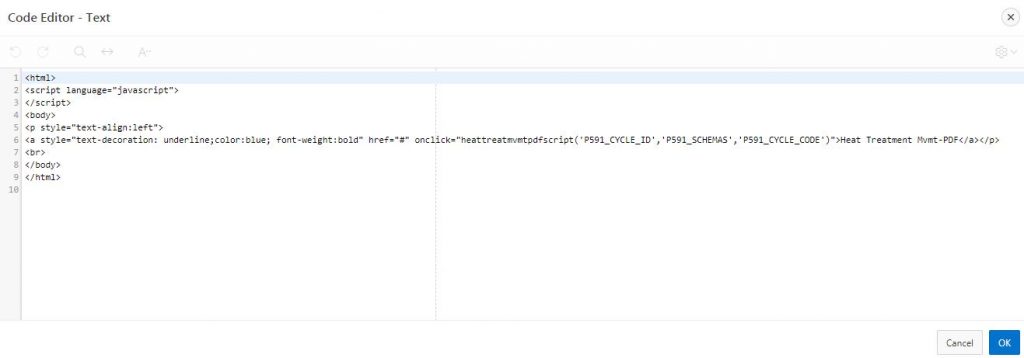 Step 3 : Enter the following code in HTML Header Text. This code calls the jasper from the server and displays as pdf.