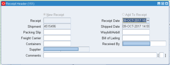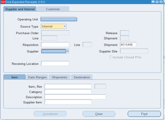 Navigation: Oracle Inventory > Transactions > Receiving > Receipts