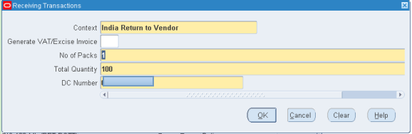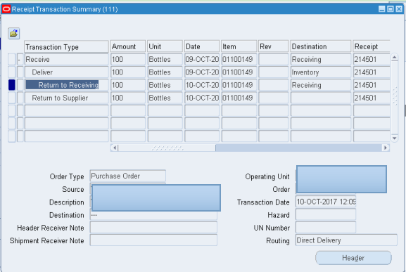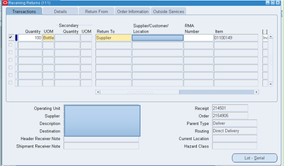 Step 1:Navigation> Oracle Purchasing > Receiving > Returns