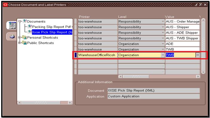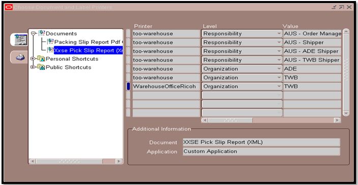 In the below case, the Pick Slip Report has been attached to the new Printer at the Organization level. So, automatically, all the Pick Slip reports which belong to the “TWB” Organization will get printed in “WarehouseOfficeRicoh” printer.