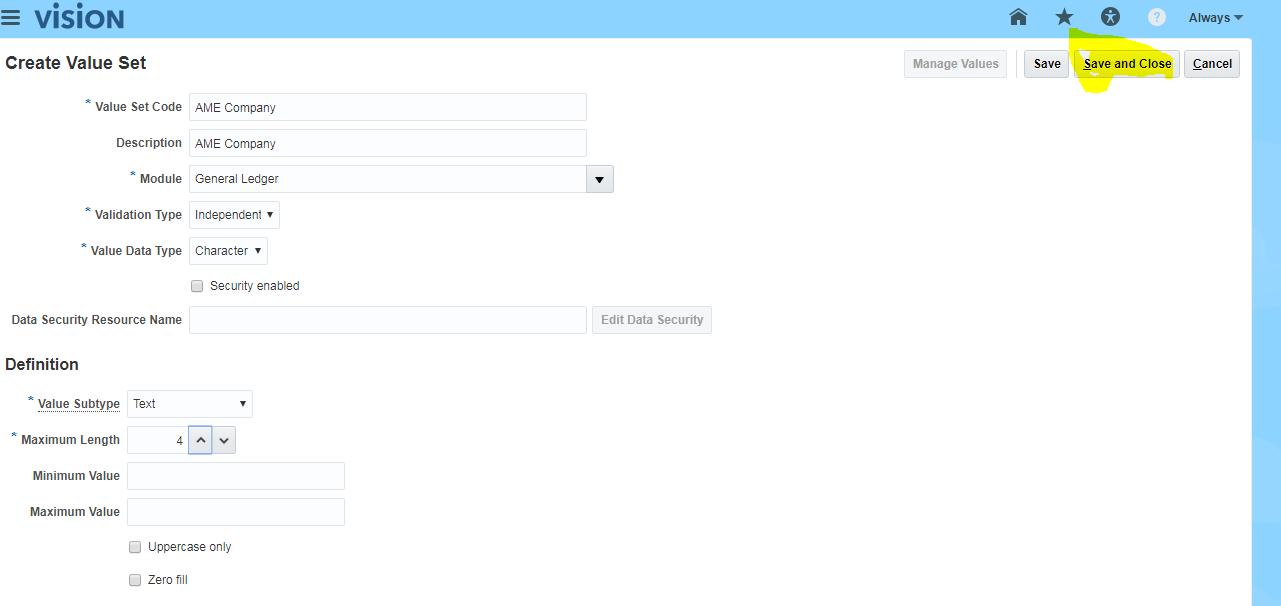 Step11: We can enter the required information for creating the Value sets in the below Screen.