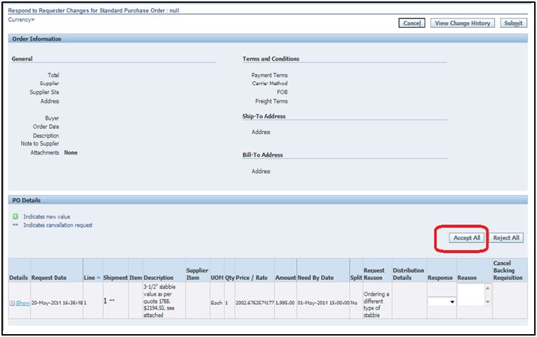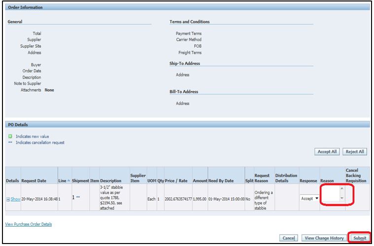 Take the desired Actions (Accept / Reject) against the Change Request in that PO
