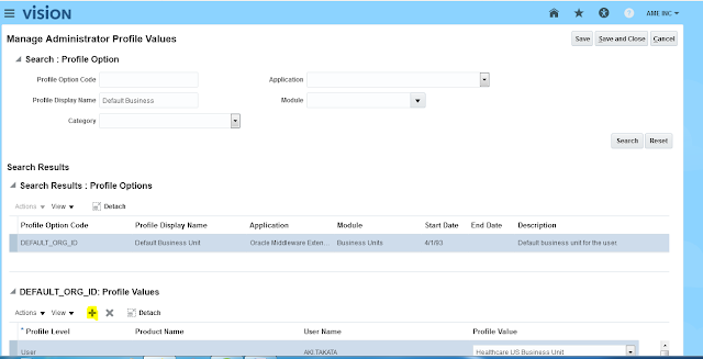 Step10: Search the Profile Display Name has Default BU and Search Results Region We can click on (+) symbol for setting up default BU.
