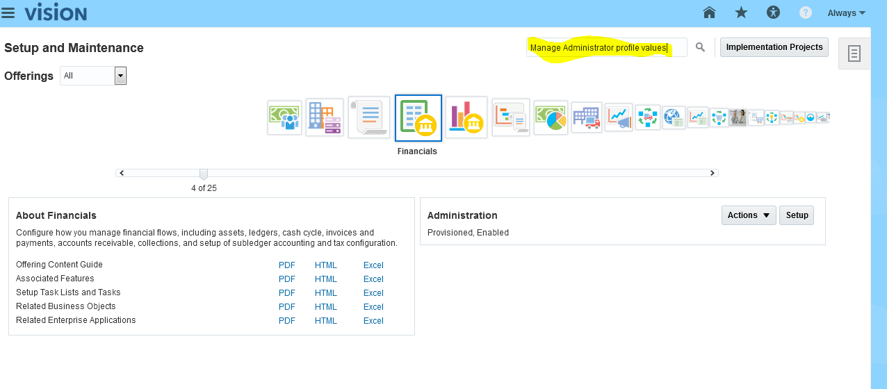 Steup4: below is the functional setup manager window, we could able to see all the offerings as provisioned and enabled.
