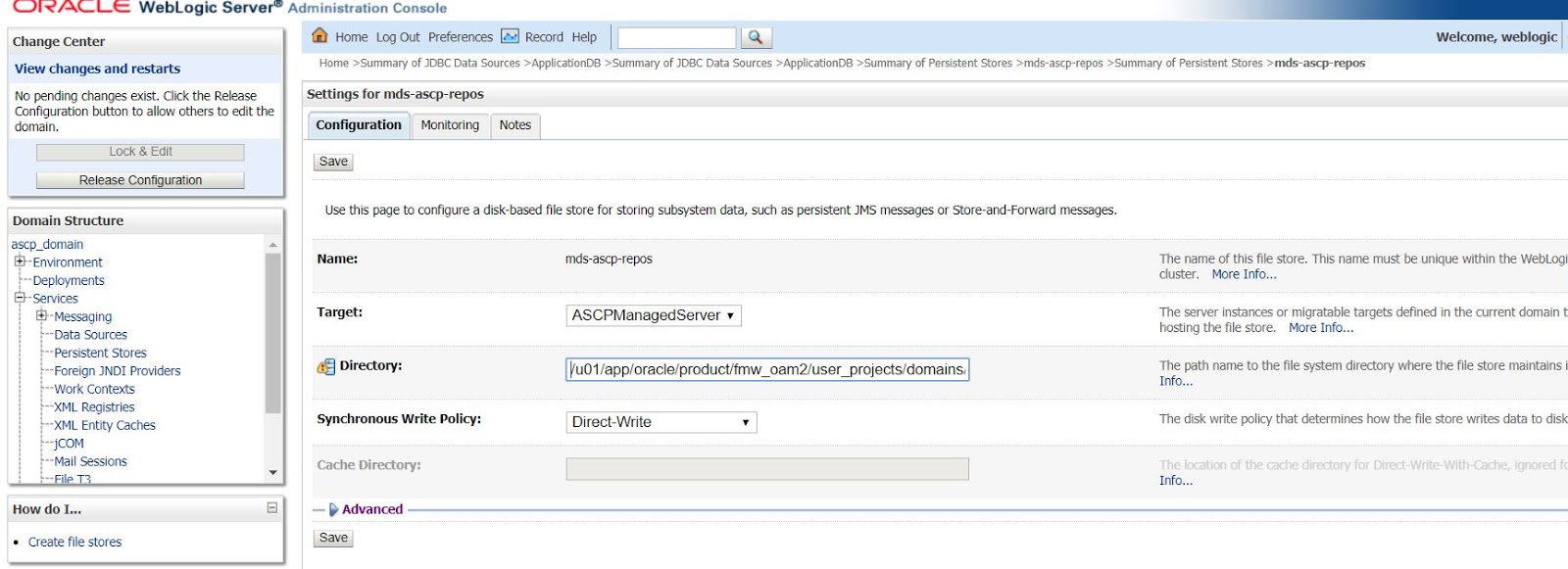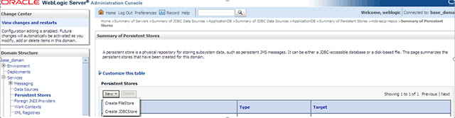 Click on ascp_domain->Services->Persistent Stores -> New -> CreateFileStore