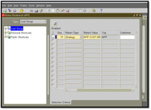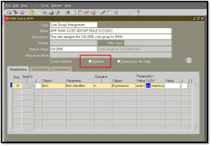 In Oracle E-Business Suite R12 Warehouse Management System (WMS), Cost Group Rules are commonly used to dynamically assign cost groups during inventory transactions. Once a cost group rule is created and assigned to a WMS strategy, the rule definition becomes read-only and the rule columns are greyed out in the WMS rules.