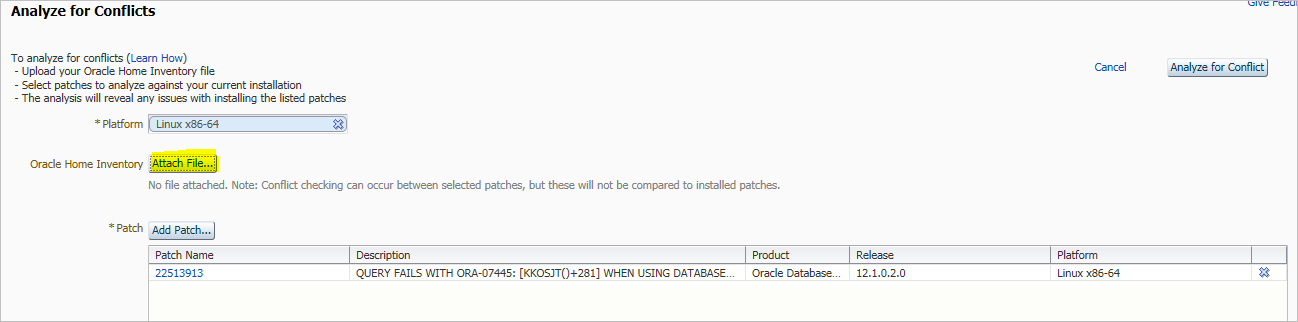 Attach the Oracle Home inventory text file (generated by the command “opatch lsinventory” found in $ORACLE_HOME/cfgtoollogs/opatch/lsinv )