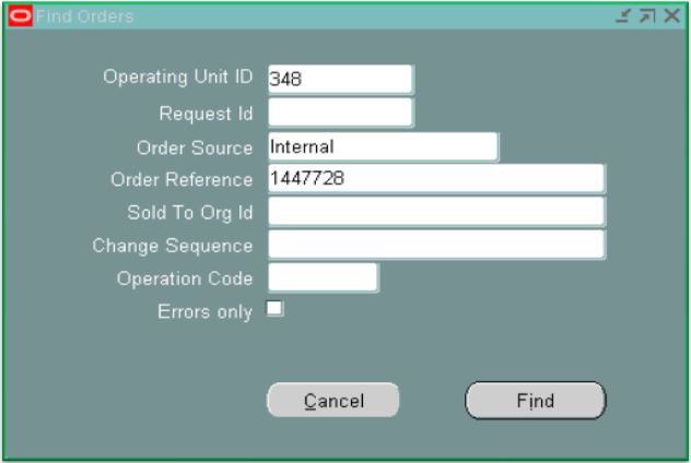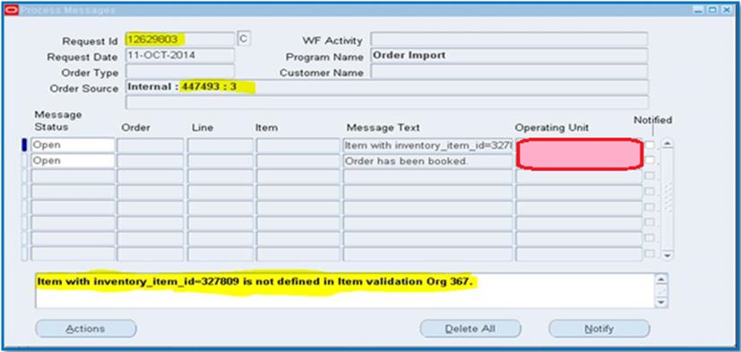 In Order Management Responsibility, “Order Import” Program is submitted with Order Source as Internal and Order Source Reference as Internal Requisition Number (447493). But the Internal Sales Order is not imported.