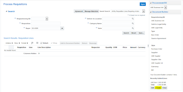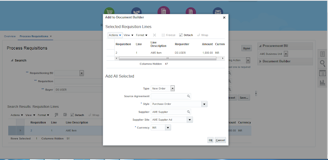 Step 13: Create PO Automatically like EBS R12 Select the Requisition and click on Add to Document Builder