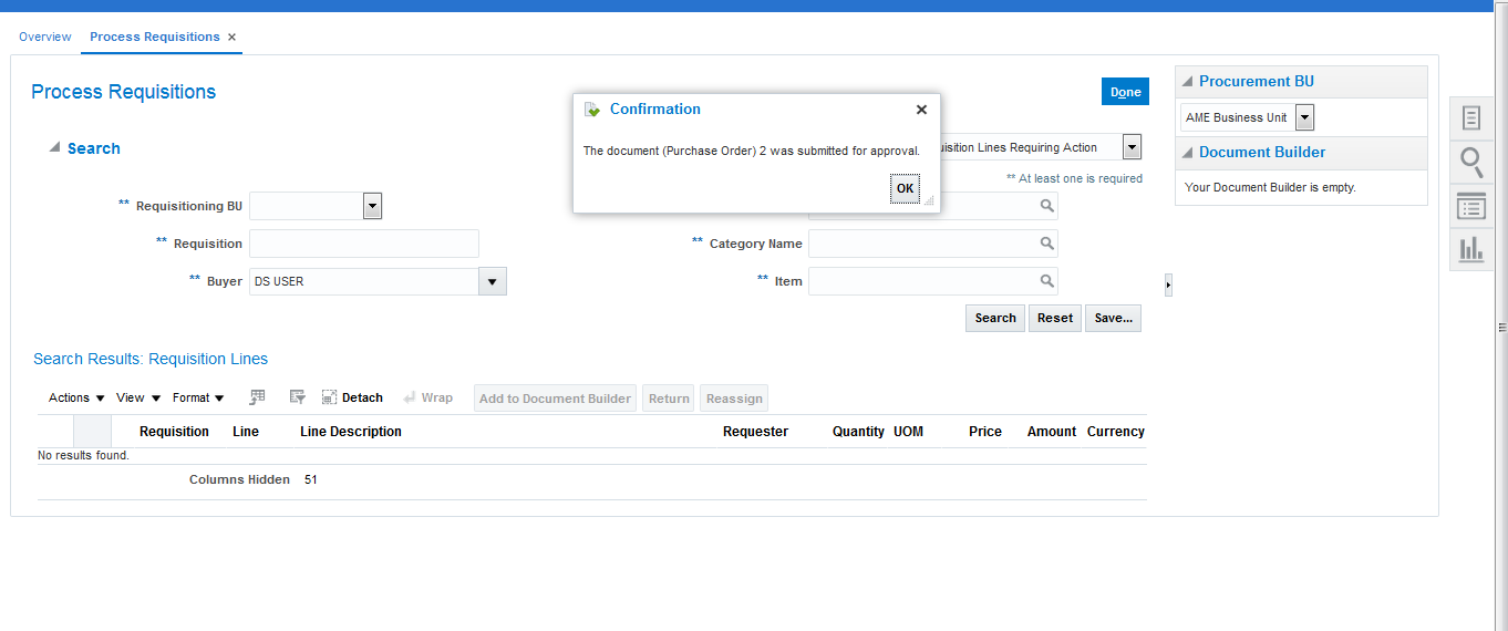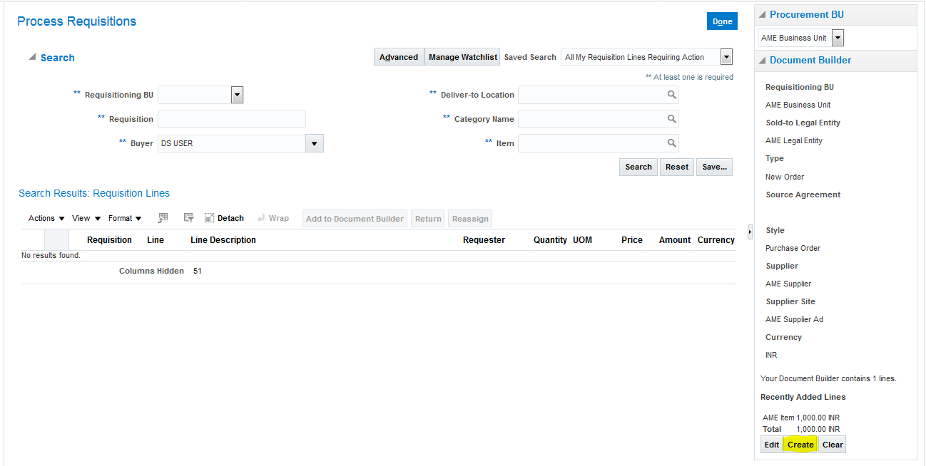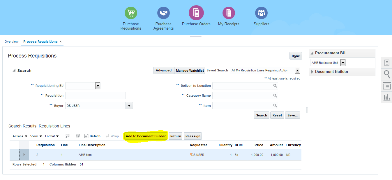 Step 13: Create PO Automatically like EBS R12 Select the Requisition and click on Add to Document Builder
