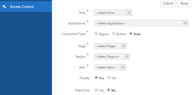 The purpose of this table is to store the privileges on Regions, Buttons, and Items for each role. Page access is controlled through the Region access (Even if one Region in a Page is given access, its Page will appear; Components cannot be created without a “Region”;)