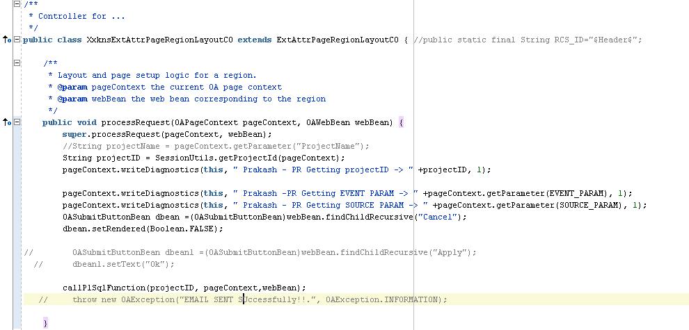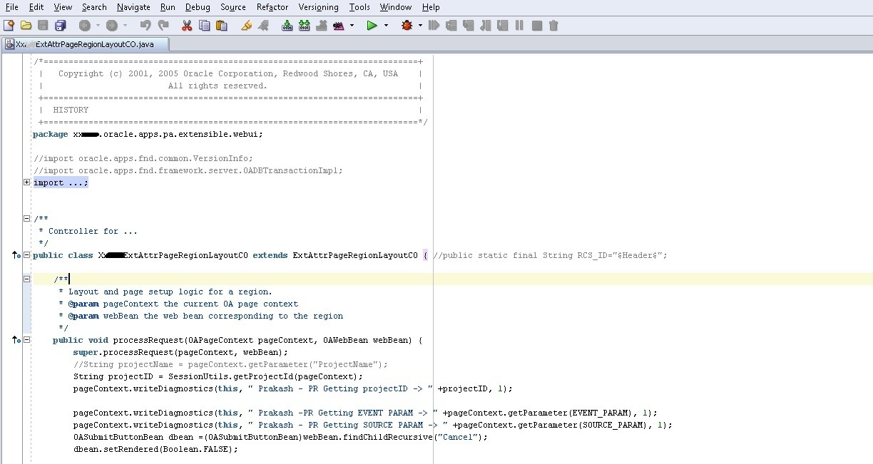 Open the controller code in JDeveloper by double click on XXExtAttrPageRegionLayoutCO.java under its directory path. Once the controller code opens, it will say its directory path of which this file is being located, which seeded controller it should be extended from; we can import some of the predefined class files in this class to get access to methods.