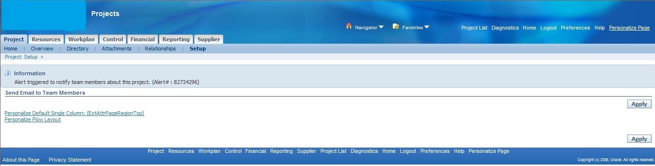 As per client requirement, whenever user click on Send Email to Team Members link, it should display information as“alert triggered to notify team members about this project” in the project setup page. To achieve this functionality, we need to extend the standard controller and add more business logic in the custom controller and mapped it to that page.