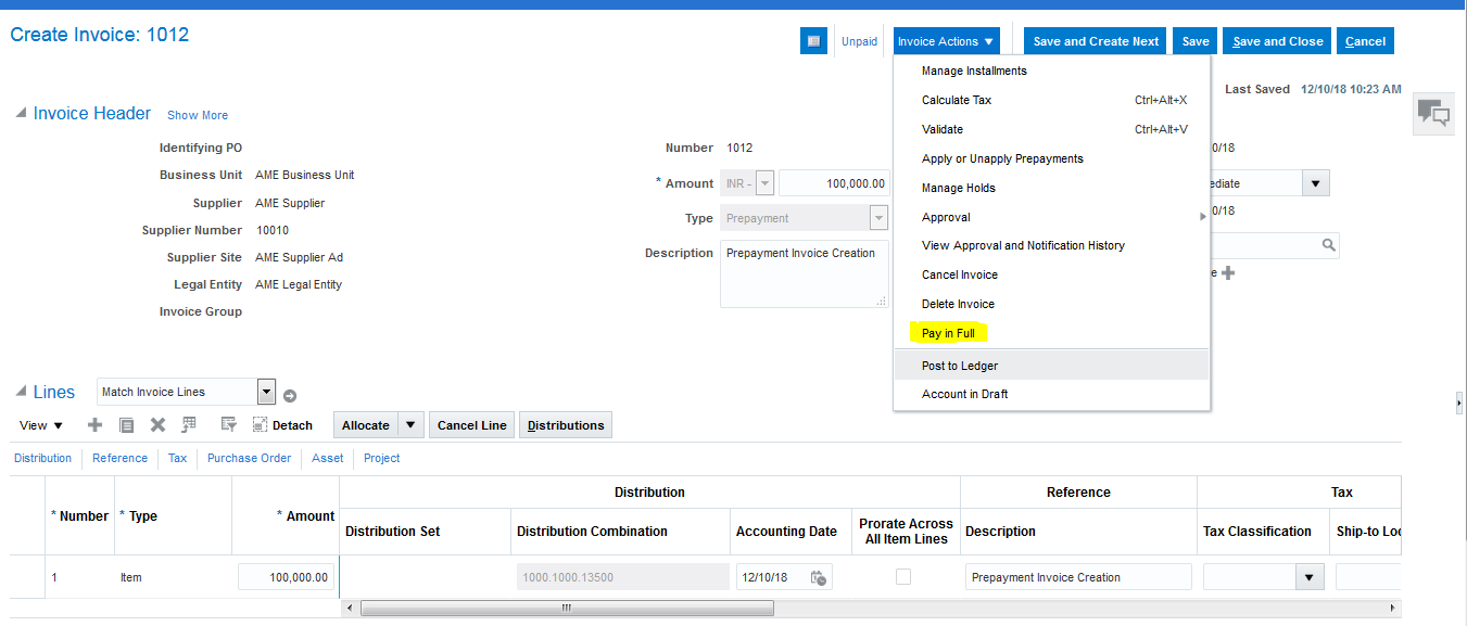 - Create Prepayment Invoice 100000